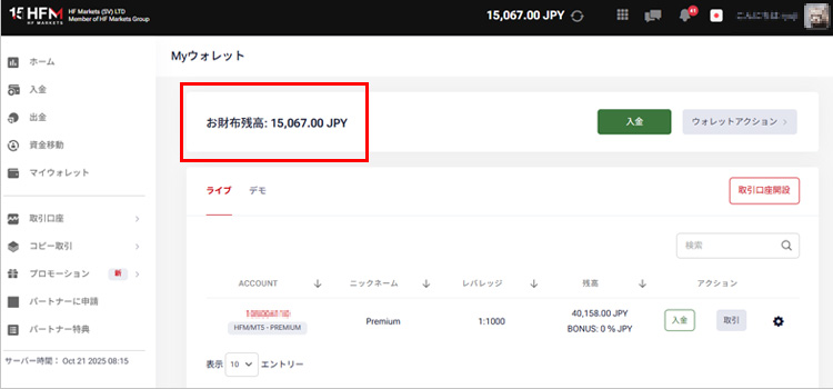 1)myHF Wallet(HFM内での口座。取引に左右されることがない)