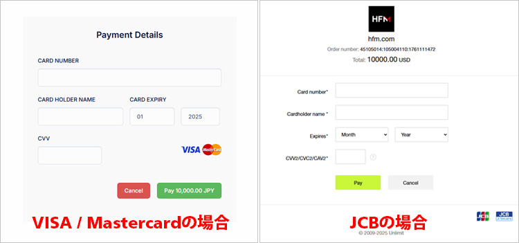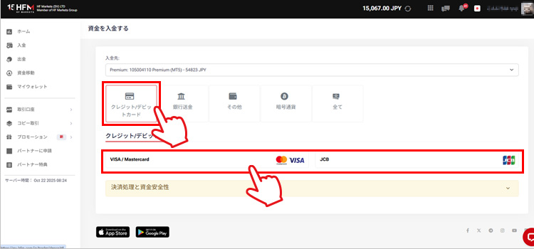HFMへの入金方法は「クレジットカード」「銀行送金」「Bitwallet」「BXONE」「暗号資産」の5種類の方法が利用できます。
