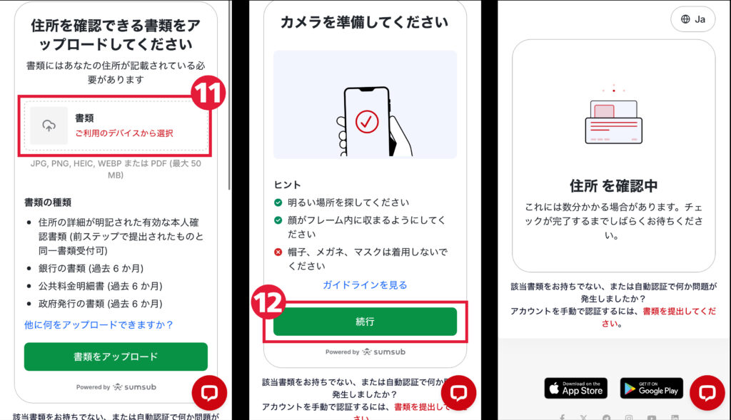 11)身分証明書の登録に続いて、住所確認書類をアップします(身分証明書と同じ書類は利用できません)