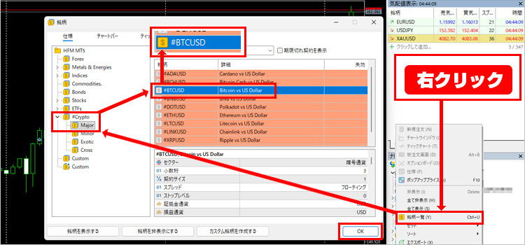 今回のビットコインの場合は #Cypto > Major > #BTCUSD