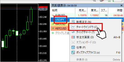通貨を右クリックし、メニューから「チャートウインドウ」を選択